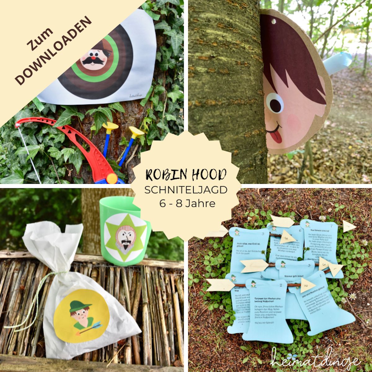 Welches Kind würde nicht gerne einmal in die Rolle Robin Hoods schlüpfen, den Reichen das Geld mopsen, um es den Armen zu geben, Abenteuer im Wald erleben und seine Pfeil- und Bogenkünste unter Beweis stellen. Bei diesem Robin Hood Kindergeburtstag kommen kleine Geburtstagshelden aus dem Sherwood Forest so richtig auf ihre Kosten. Im Do-it-yourself Rundum-Sorglos-Paket ist alles enthalten, was du für eine gelungene Kinderparty brauchst: besondere Robin Hood Einladung zum Selbermachen, zum Motto passende Partydeko zum Basteln, spannende Schnitzeljagd mit 7 Stationen und Aufgaben, Etiketten und einem Rätsel für die Mitgebseltüte, To-do-Liste und Tipps & Tricks für die Umsetzung. Einfach ausdrucken, basteln, fertig.